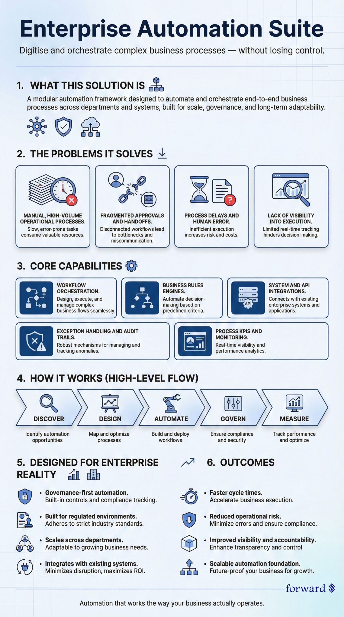 Unlike task-based automation tools, this solution focuses on process continuity, governance, and scale.